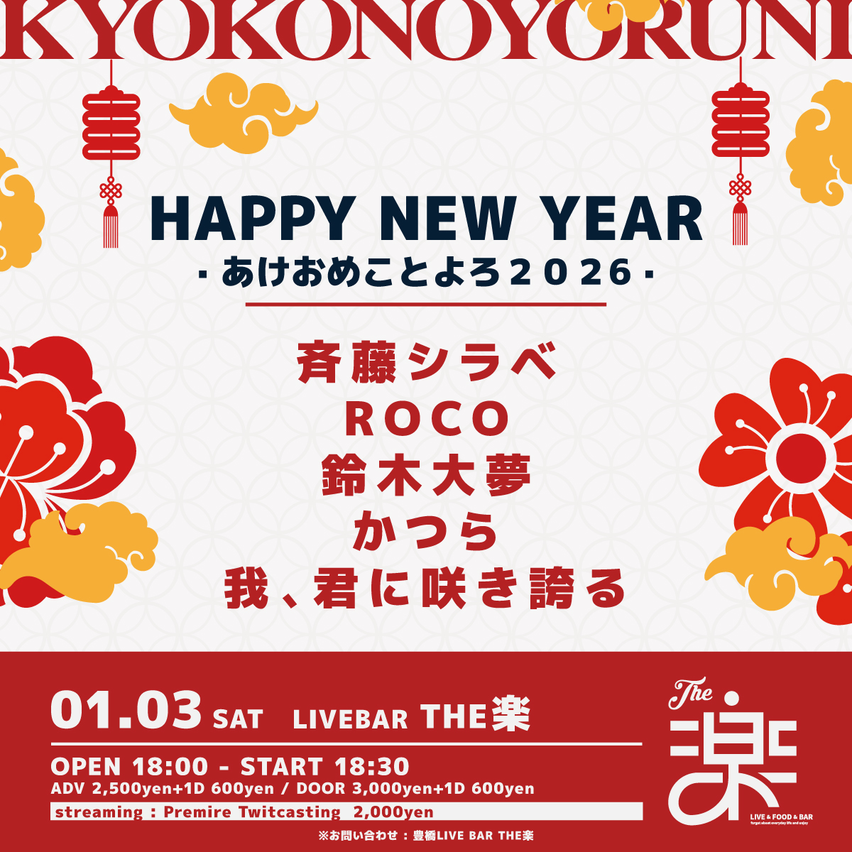 2026.1.3 SAT あけおめことよろ2026 OPEN 18:00 START 18:30 CAST 斉藤シラベ/ROCO/鈴木大夢/かつら/我、君に咲き誇る TICKET ADV : 2,500 円 DOOR : 3,000 円 入場時にドリンク代 600円 が別途必要となります。 STREAMING 2,000 円 プレミアツイキャス