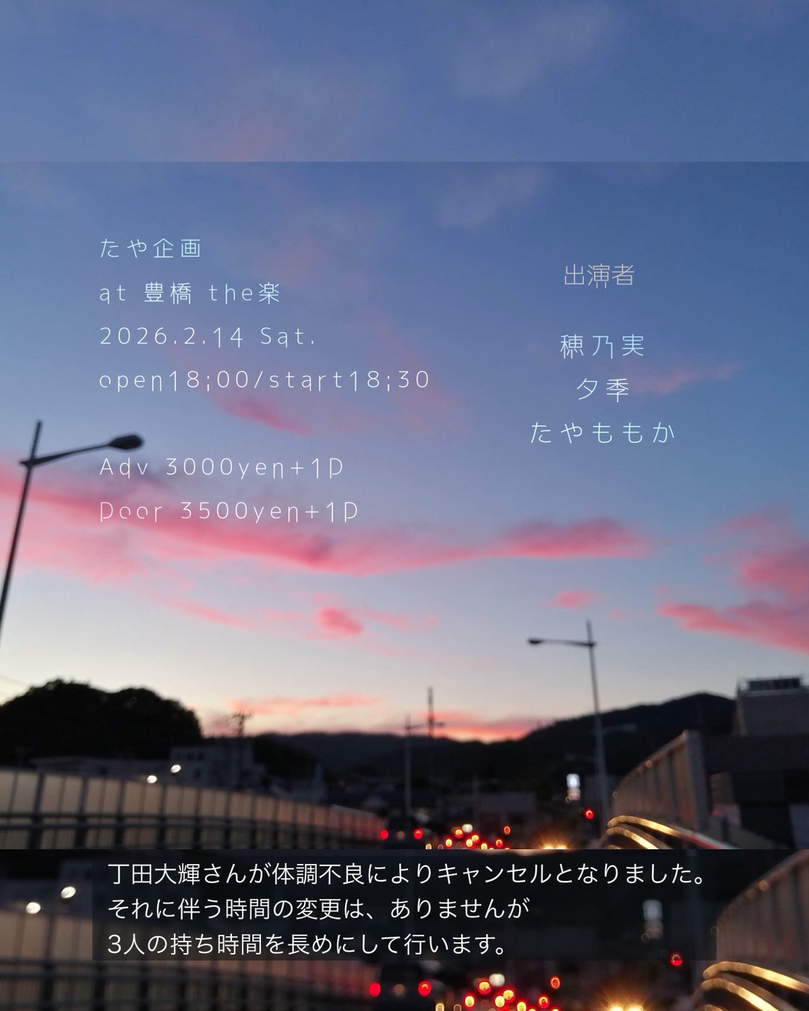 2026.2.14 SAT たや企画 OPEN 18:00 START 18:30 CAST たやももか/穂乃実/夕季 TICKET ADV : 3,000 円 DOOR : 3,500 円 入場時にドリンク代 600円 が別途必要となります。