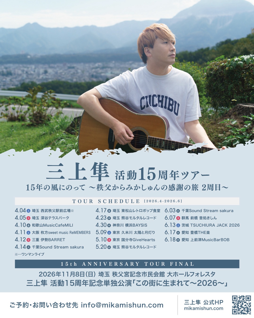 2026.6.17 WED 三上隼 活動15周年ツアー 「15年の風にのって 秩父からみかしゅんの感謝の旅 豊橋編」 OPEN 18:30 START 19:00 CAST 三上隼/andmore TICKET ADV : 2,500 円 DOOR : 3,000 円 入場時にドリンク代 600円 が別途必要となります。 チケットの取り置きはこちら イベント名 三上隼 活動15周年ツアー 「15年の風にのって 秩父からみかしゅんの感謝の旅 豊橋編」 必須 名前(姓) 苗字を漢字で入力してください。 必須 名前(名) 名前を漢字で入力してください。 必須 フリガナ(セイ) 苗字をカタカナで入力してください。 必須 フリガナ(メイ) 名前をカタカナで入力してください。 必須 メールアドレス 受信可能なメールアドレスをご入力ください 必須 携帯電話番号 例) 090-1234-5678 任意 郵便番号 例) 444-0888 任意 住所1 例) 愛知県豊橋市駅前大通1丁目27 任意 住所2(マンション名・部屋番号など) 例) 大石ビル 4F 必須 取り置き希望アーティスト名 三上隼 andmore 必須 購入枚数 : 入力いただいたメールアドレスに、通知メールが届きますのでご確認ください。 入力後には、トップページへと移動します。