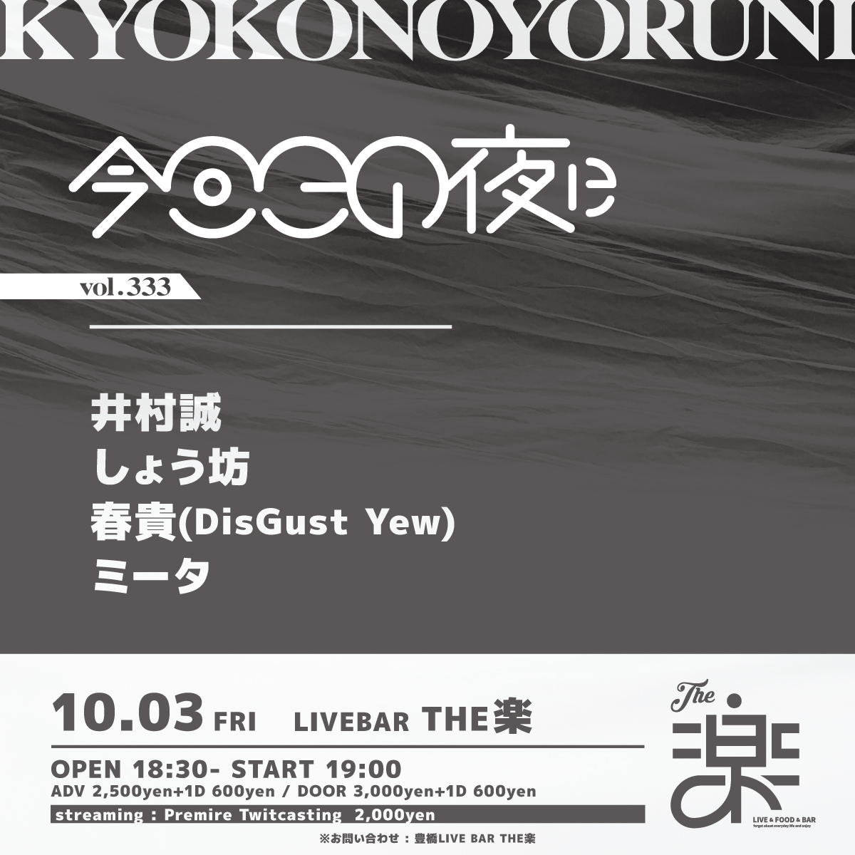 2025.10.3 FRI 今日この夜にvol.333 OPEN 18:30 START 19:00 CAST 井村誠/しょう坊/春貴(DisGust Yew)/ミータ TICKET ADV : 2,500 円 DOOR : 3,000 円 入場時にドリンク代 600円 が別途必要となります。 STREAMING 2,000 円 プレミアツイキャス