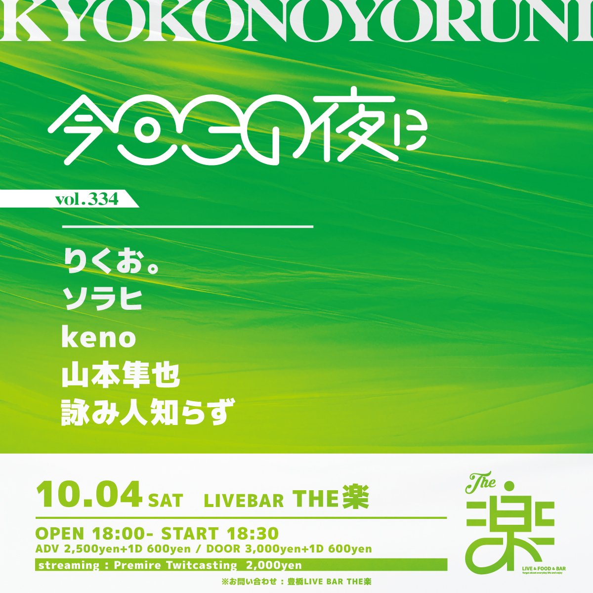 2025.10.4 SAT 今日この夜にvol.334 OPEN 18:00 START 18:30 CAST りくお。/ソラヒ/keno/山本隼也/詠み人知らず TICKET ADV : 2,500 円 DOOR : 3,000 円 入場時にドリンク代 600円 が別途必要となります。 STREAMING 2,000 円 プレミアツイキャス