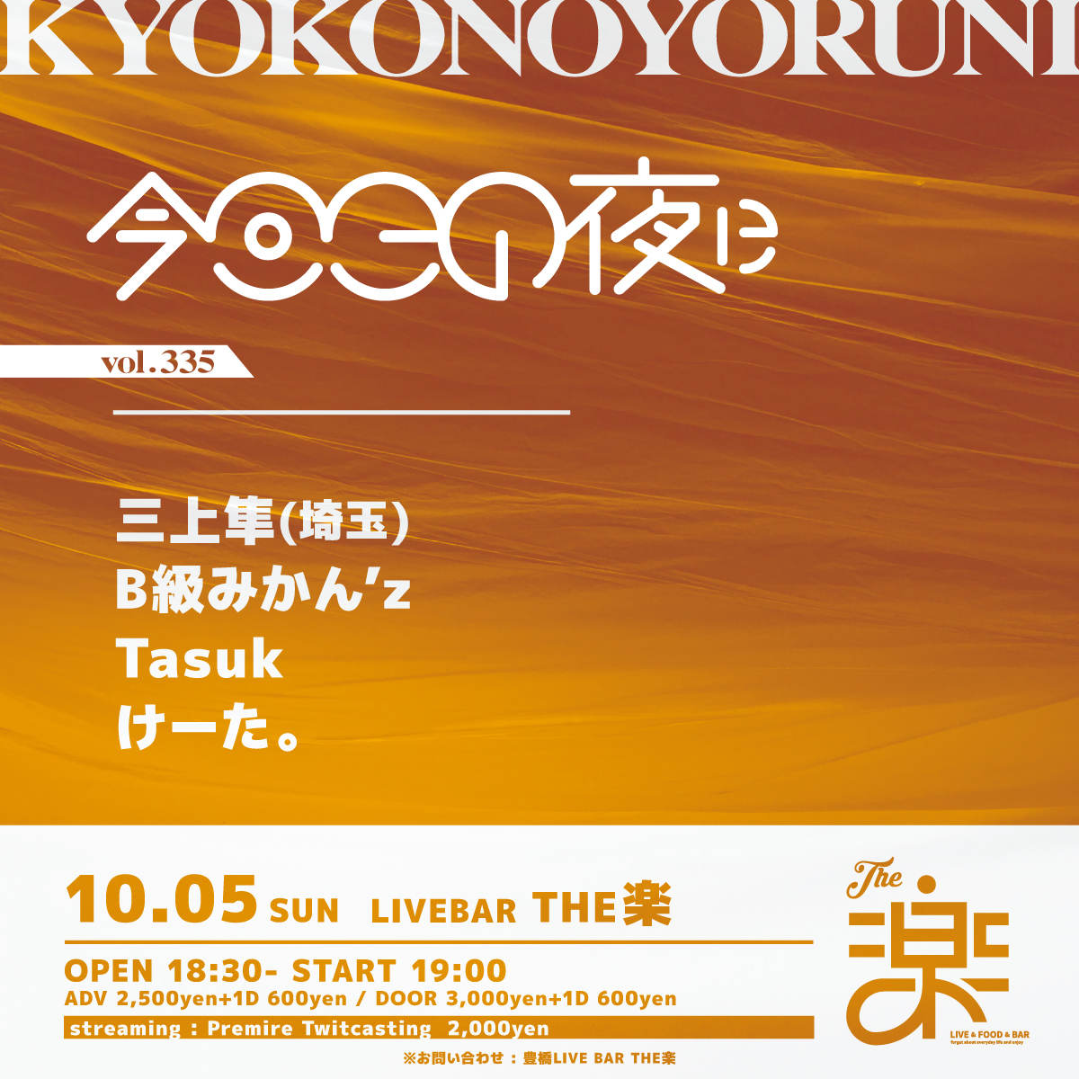2025.10.5 SUN 今日この夜にvol.335 OPEN 18:30 START 19:00 CAST 三上隼/B級みかん’z/Tasuk/けーた。 TICKET ADV : 2,500 円 DOOR : 3,000 円 入場時にドリンク代 600円 が別途必要となります。 STREAMING 2,000 円 プレミアツイキャス