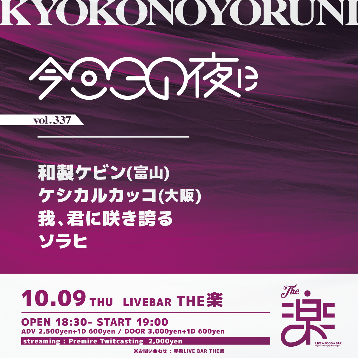 2025.10.9 THU 今日この夜にvol.337 OPEN 18:30 START 19:00 CAST 和製ケビン/ケシカルカッコ/我、君に咲き誇る/ソラヒ TICKET ADV : 2,500 円 DOOR : 3,000 円 入場時にドリンク代 600円 が別途必要となります。 STREAMING 2,000 円 プレミアツイキャス