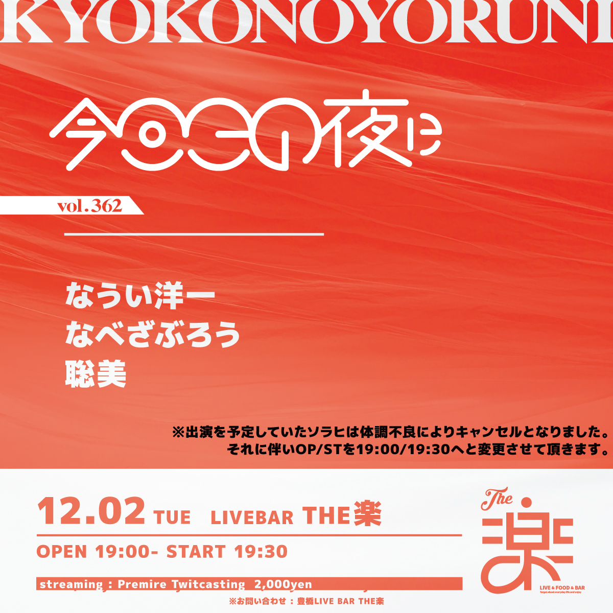 それに伴いOP/STを19:00/19:30へと変更させて頂きます。