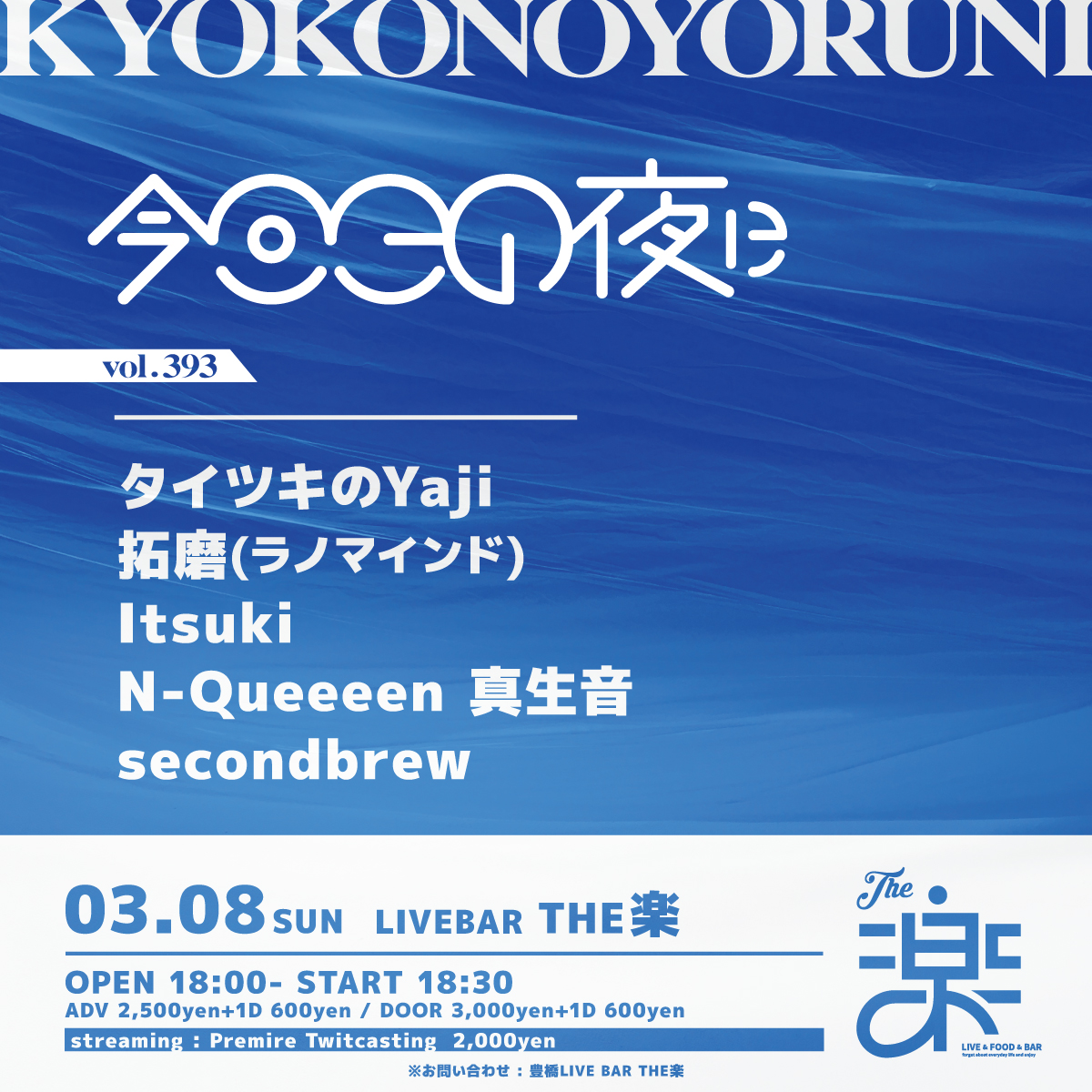 - ADV : 2,500 円 DOOR : 3,000 円 入場時にドリンク代 600円 が別途必要となります。