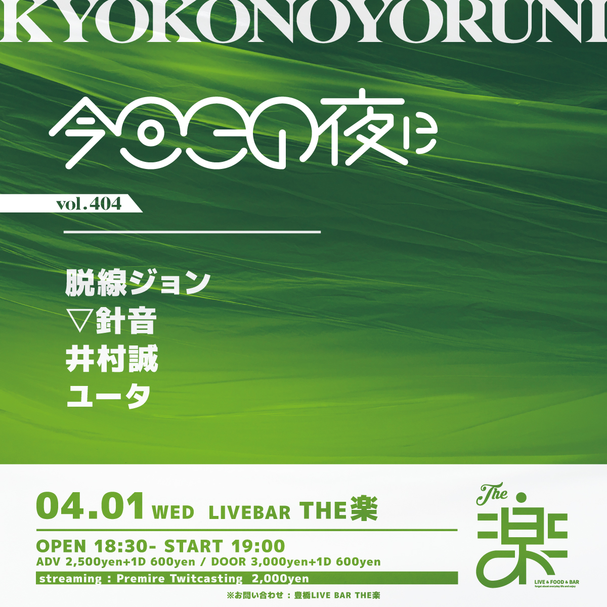 2026.4.1 WED 今日この夜にvol.404 OPEN 18:30 START 19:00 CAST 脱線ジョン/▽針音/井村誠/ユータ TICKET ADV : 2,500 円 DOOR : 3,000 円 入場時にドリンク代 600円 が別途必要となります。 STREAMING 2,000 円 プレミアツイキャス