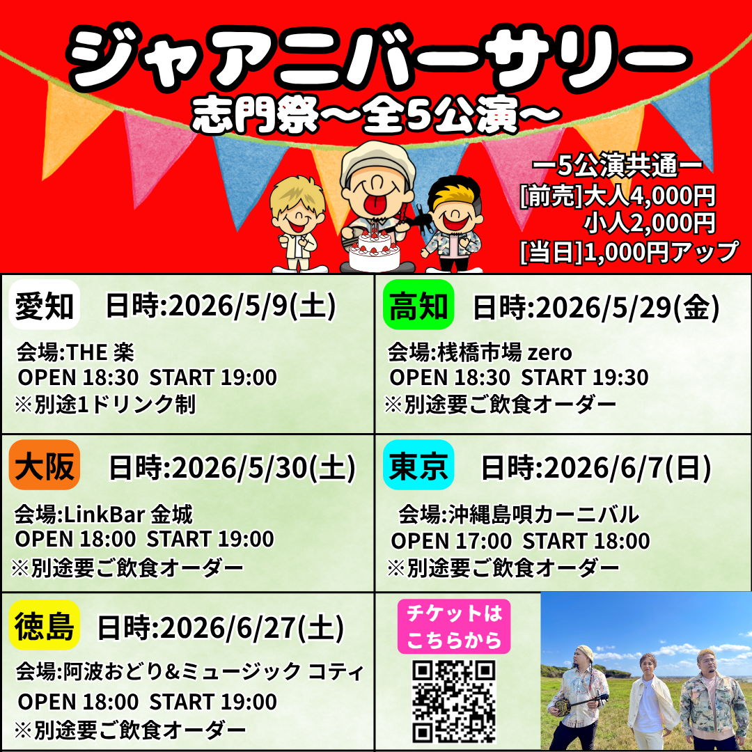 2026.5.9 SAT ~ジャアニバーサリー~志門祭~~愛知.高知.大阪.東京.徳島5公演~ 志門誕生日を祝う会 OPEN 18:30 START 19:00 CAST ジャアバーボンズ TICKET ADV : 4,000円 円 DOOR : 5,000円 円 入場時にドリンク代 600円 が別途必要となります。 ライブポケット