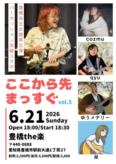 6.21 SUN OPEN 18:00 / START 18:30 あずさpre.ここから先まっすぐvol.5 あずさ(全アーティストパーカッションコラボ)/cozmu/qyu/ゆうメデリー/栞 ADV : 2,500 円 / DOOR : 3,000 円 詳細はこちら PREV
