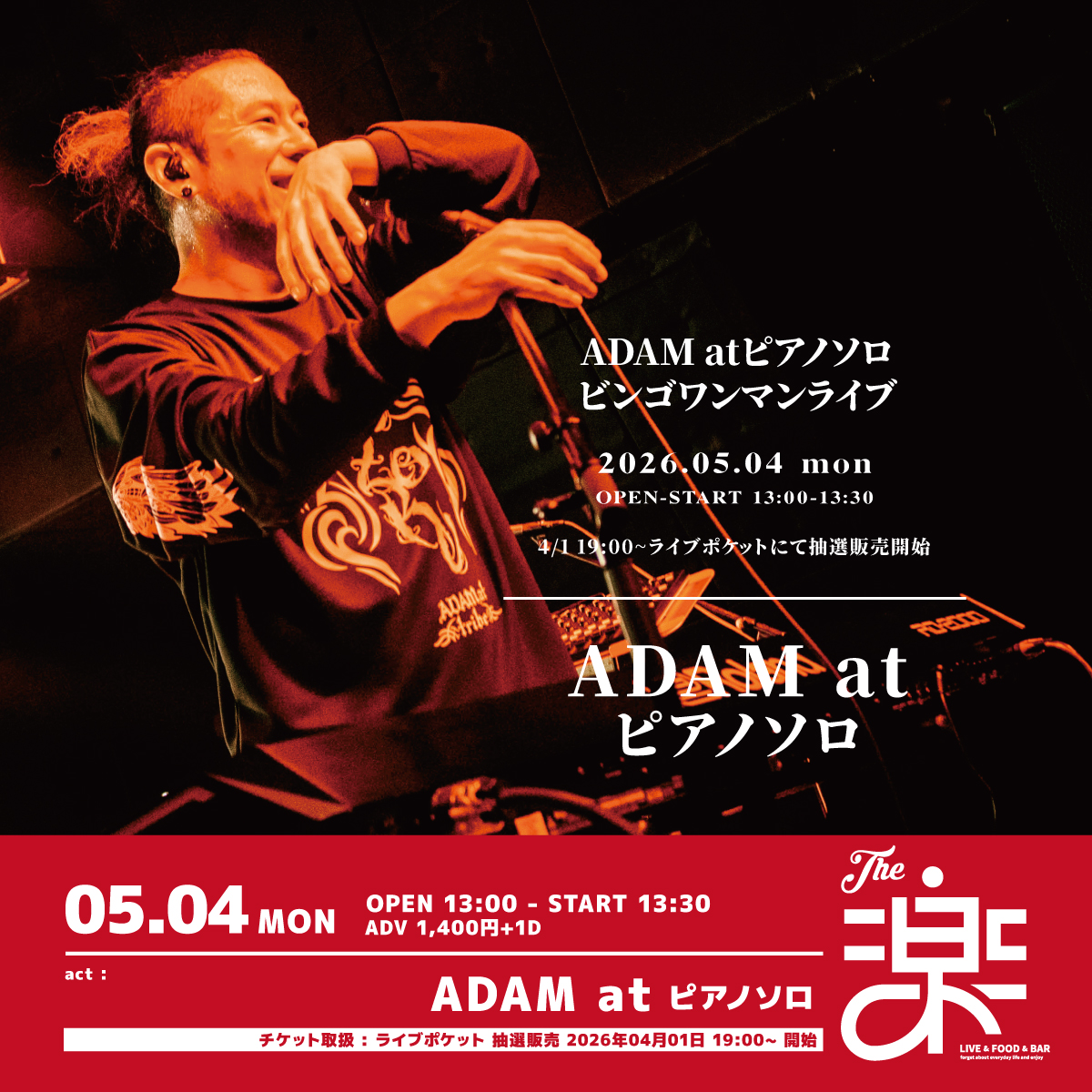 2026.5.4 MON ※こちらのイベントはライブポケットにて抽選販売となります。 ADAM atピアノソロ ビンゴワンマンライブ OPEN 13:00 START 13:30 CAST ADAM atピアノソロ TICKET ADV : 1,400 円 DOOR : 未定 円 入場時にドリンク代 600円 が別途必要となります。 ライブポケット