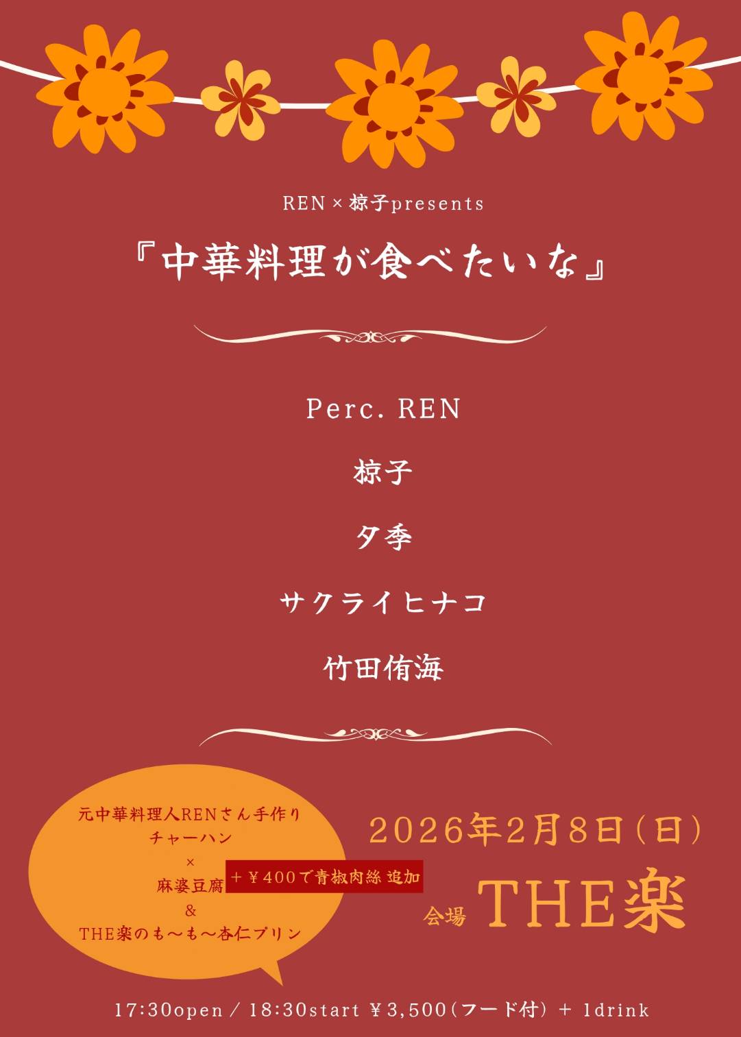 2026.2.8 SUN REN×椋子pre.「中華料理が食べたいな」 OPEN 17:30 START 18:30 CAST Perc.REN/椋子/夕季/サクライヒナコ/武田侑海 TICKET ADV : 3,500 円 DOOR : 3,500 円 3,500円(フード付き) 入場時にドリンク代 600円 が別途必要となります。