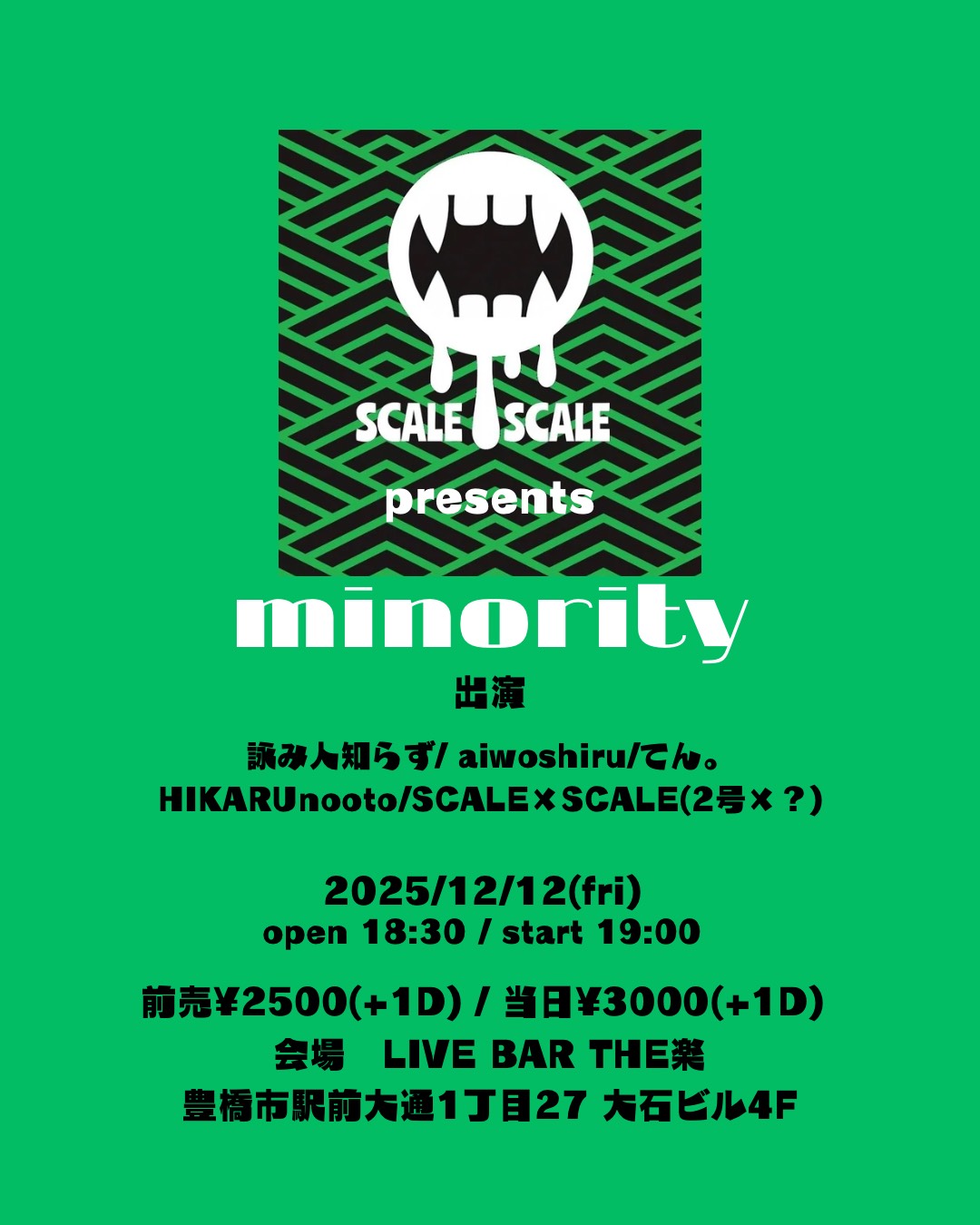 2025.12.12 FRI SCALExSCALE presents minority OPEN 18:30 START 19:00 CAST 詠み人知らず/aiwoshiru/てん。/HIKARUnooto/SCALExSCALE(2号x?) TICKET ADV : 2,500 円 DOOR : 3,000 円 入場時にドリンク代 600円 が別途必要となります。 チケットの取り置きはこちら イベント名 SCALExSCALE presents minority 必須 名前(姓) 苗字を漢字で入力してください。 必須 名前(名) 名前を漢字で入力してください。 必須 フリガナ(セイ) 苗字をカタカナで入力してください。 必須 フリガナ(メイ) 名前をカタカナで入力してください。 必須 メールアドレス 受信可能なメールアドレスをご入力ください 必須 携帯電話番号 例) 090-1234-5678 任意 郵便番号 例) 444-0888 任意 住所1 例) 愛知県豊橋市駅前大通1丁目27 任意 住所2(マンション名・部屋番号など) 例) 大石ビル 4F 必須 取り置き希望アーティスト名 詠み人知らず aiwoshiru てん。 HIKARUnooto SCALExSCALE(2号x?) 必須 購入枚数 : 入力いただいたメールアドレスに、通知メールが届きますのでご確認ください。 入力後には、トップページへと移動します。