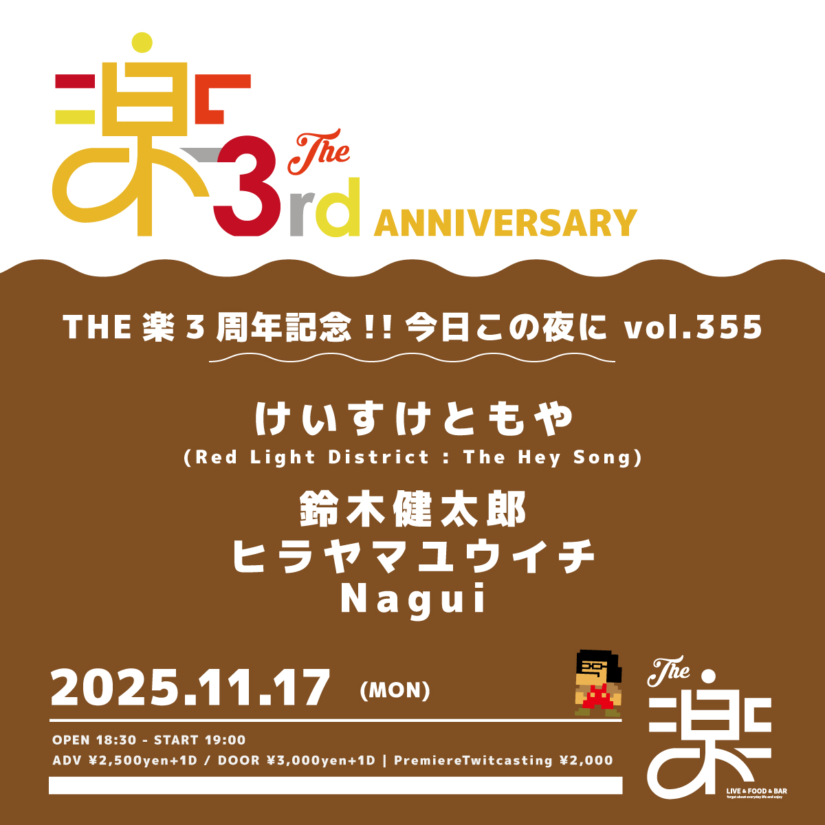 2025.11.17 MON THE楽3周年記念!!今日この夜にvol.355 OPEN 18:30 START 19:00 CAST けいすけともや (Red Light District : The Hey Song)/鈴木健太郎/ヒラヤマユウイチ/Nagui TICKET ADV : 2,500 円 DOOR : 3,000 円 入場時にドリンク代 600円 が別途必要となります。 STREAMING 2,000 円 プレミアツイキャス